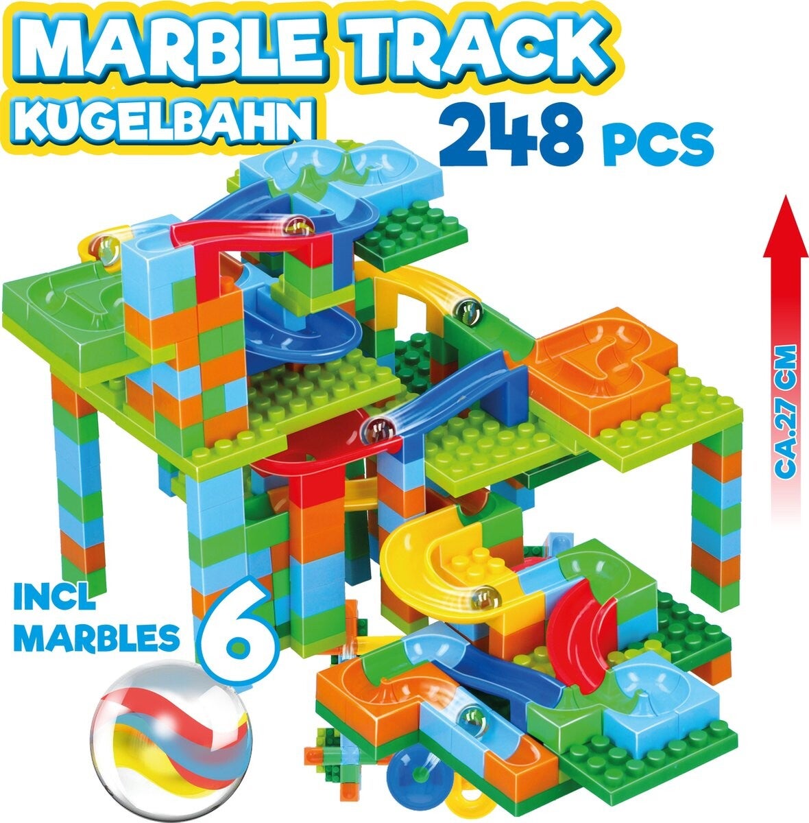 De 248-delige knikkerset bestaat uit 6 knikkers en 242 bouwstenen in allerlei kleuren, vormen en maten. Zo heb je diverse soorten bochten, plateaus en blokken in geel, rood, groen, oranje en blauw. De stenen zijn gemaakt van het kunststof polystyreen.